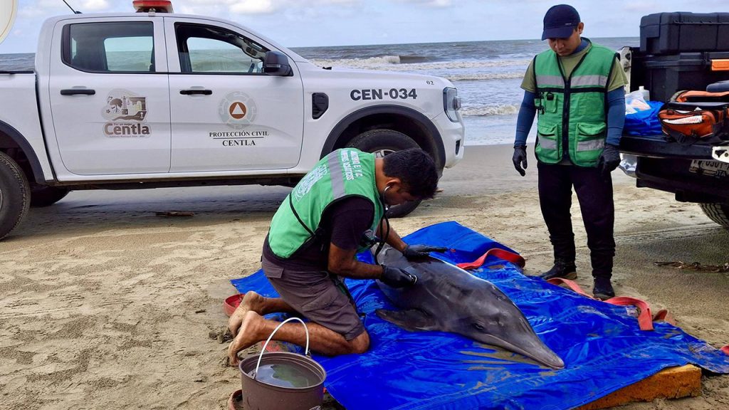 Protección Civil atienda reporte de delfín varado a orillas de «Playa Azul» en Villa Cuauhtémoc