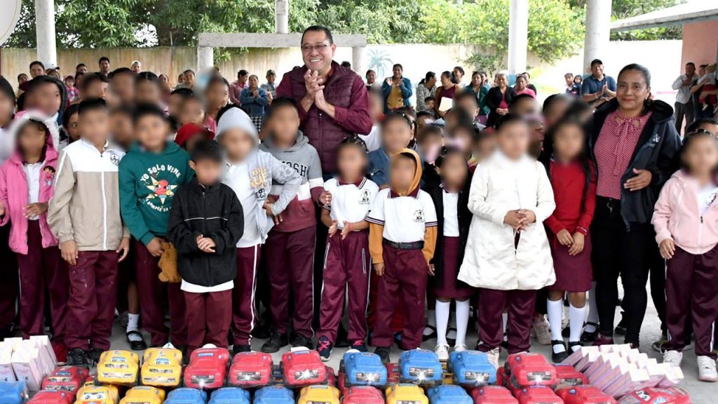 Entrega juguetes Saúl Armando Rodríguez Rodríguez a alumnos de primero a sexto grado de la escuela primaria «José María Morelos»